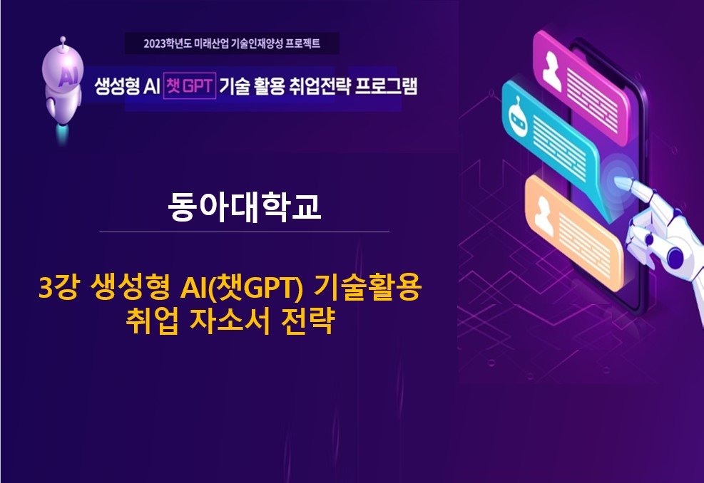 3강 생성형 AI(챗 GPT)기술 활용 취업 자소서 전략 챗 GPT를 활용한 취업정보 탐색 및 직무분석 챗 GPT를 활용한 키워드 도출... 인코칭연구소 이주영 2023년 09월 18일2023년 11월 01일