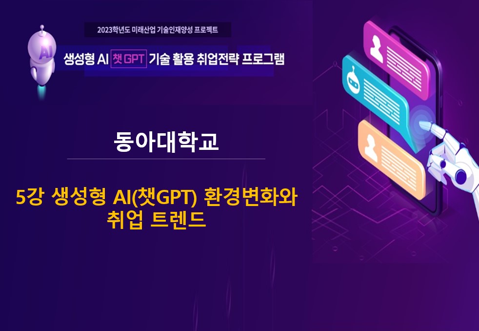5강 생성형AI (챗GPT) 기술의 이해와 취업트렌드 생성형AI (챗GPT) 기술의 원리와 이해를 통해 신산업의 변화 속 취업트렌드를 학습. 인코칭연구소 이주영 2023년 09월 18일2023년 11월 01일